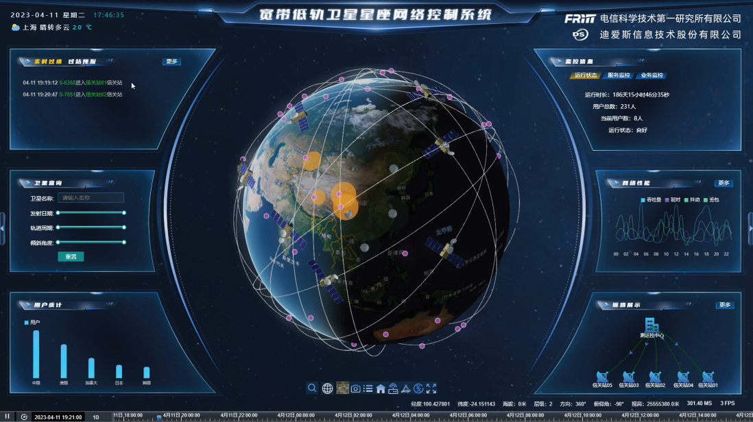 采用自主开发的运控软件平台,系统提供卫星轨道计算模拟,过境过站实时监测、卫星信息查询、覆盖用户统计等管理功能,保障低轨卫星安全、稳定可靠地运行。