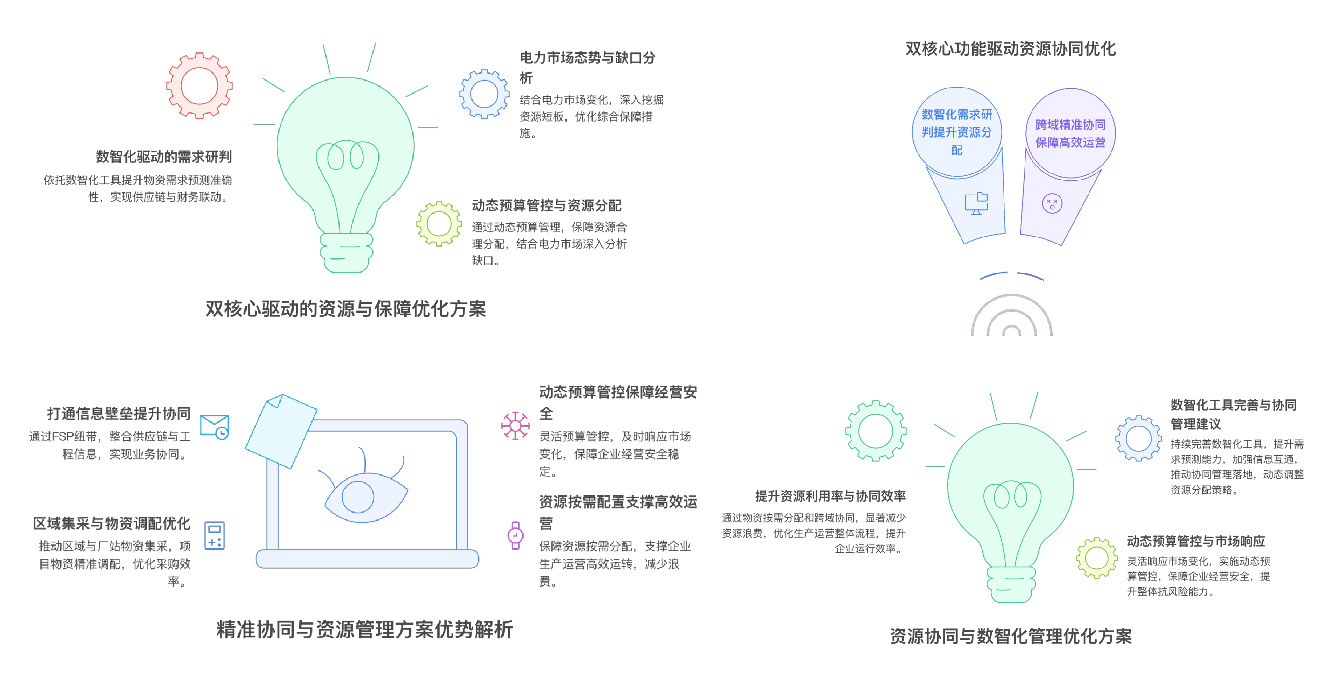 需求研判层面,以数智化技术为支撑,联动供应链(SCM)、财务管理(FMS)等核心业务域,结合电力市场动态态势,精准预判物资需求、动态管控预算额度,同步系统性分析资源缺口,为资源配置提供科学依据;精准协同层面,以综合管理支撑(FSP)为核心纽带,打通供应链(SCM)、工程项目管理(PPM)等跨业务域壁垒,实现区域与厂站物资集中采购、项目物资精准调配,强化跨域资源协同,保障资源按需配置,支撑生产运营高效运转。