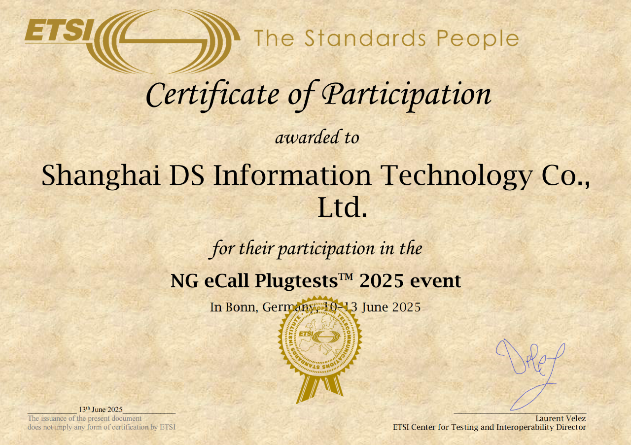2025年6月10日至13日,上海迪爱斯信息技术有限公司(以下简称“迪爱斯”)参与了由欧洲电信标准化组织(ETSI)和德国电信(DT)联合主办,在德国波恩召开的NG eCall集成测试活动。迪爱斯作为中国唯一参与测试的PSAP(公共安全应答点),全程参与了4天13轮共177条用例的紧密测试。我司融合通信系统300S系统顺利通过了与大众、宝马、奥迪、保时捷等整车企业、Continental、Kontron等车载设备供应商的集成验证测试,获得主办方颁发的认证证书。