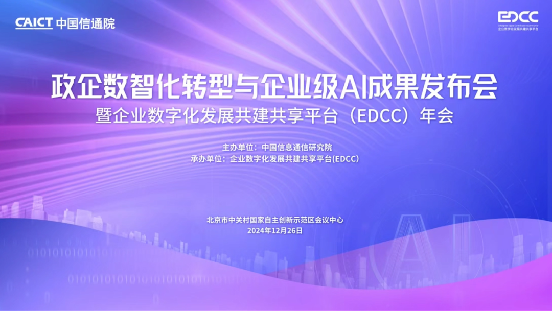 2024年12月26日,迪爱斯公司受邀出席由中国信息通信研究院在北京召开的“2024政企数智化转型与企业级AI成果发布会暨企业数字化发展共建共享平台(EDCC)年会”,共探政企数智化转型与企业级人工智能应用未来。