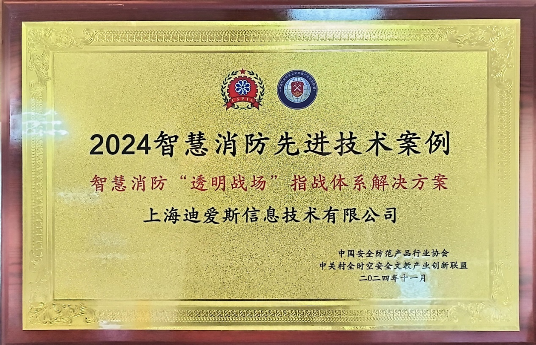 优秀解决方案颁奖环节,迪爱斯凭借2024年在政府数字化转型下的数字化消防队站建设及消防5G视频报警等创新应用在智慧消防领域的卓越表现和创新成果,荣获“智慧消防先进技术案例”表彰。这一殊荣不仅是对我司技术实力的高度认可,更是对迪爱斯在智慧消防赛道持续耕耘的肯定。