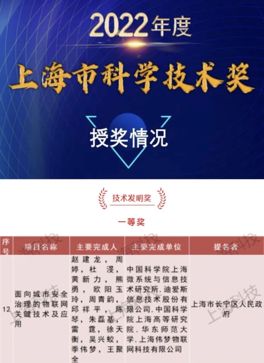 近日,2022年度上海市科学技术奖公布,迪爱斯公司与中科院上海微系统与信息技术研究所、中科院上海高等研究院、华东师范大学、上海伟梦物联网科技有限公司共同完成的“面向城市安全治理的物联网关键技术的应用”项目荣获“2022年上海市技术发明一等奖”。