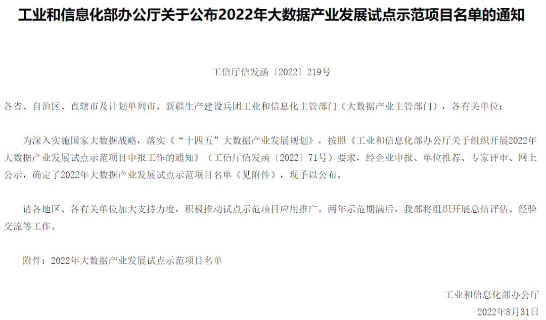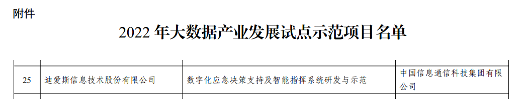2022年9月8日,工业和信息化部发布《关于公布2022年大数据产业发展试点示范项目名单的通知》(工信厅信发函〔2022〕219号),公布《2022年大数据产业发展试点示范项目名单》。迪爱斯信息技术股份有限公司的“数字化应急决策支持及智能指挥系统研发与示范”项目成功入选。这是继迪爱斯公司获得工信部《2018年大数据产业发展试点示范项目》后,再一次斩获殊荣。