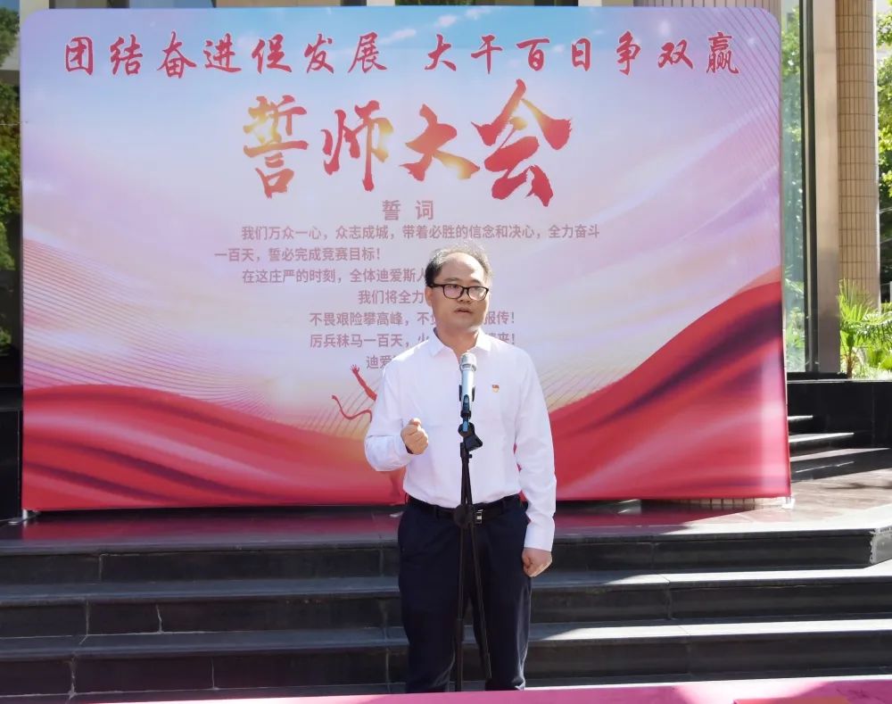 9月9日上午,为全力决战年度工作,圆满完成目标任务,迪爱斯公司举行“团结奋进促发展,大干百日争双赢”年度冲刺暨劳动竞赛誓师大会。电信一所党委书记、董事长兼迪爱斯公司党总支书记、董事长、总经理邱祥平出席大会并讲话,迪爱斯公司经营班子及各部门代表参会,大会由迪爱斯公司常务副总经理周赵云主持。