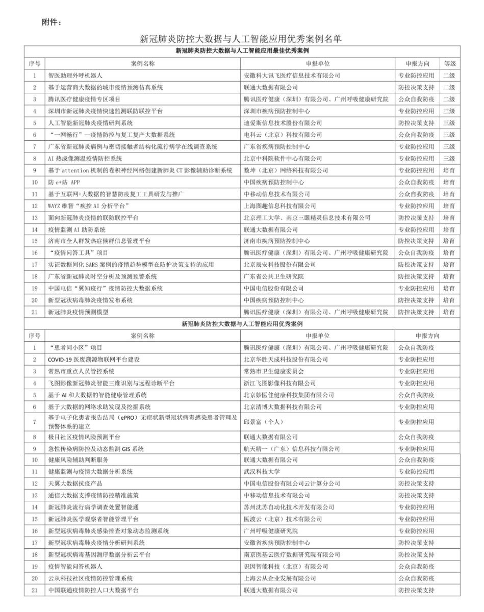为进一步促进大数据与人工智能技术在疫情防控中的创新应用,助力打赢疫情防控阻击战,中华预防医学会健康大数据与人工智能应用专业委员会组织有关专家,遴选出一批在新冠肺炎防控中创新程度高、应用价值大、示范效应强的大数据与人工智能应用案例。近期,中华预防医学会发布了本次征集活动的评选结果,最终全国共评出21个最佳优秀案例(一级案例未达到评选标准暂空缺,二级3个、三级5个及培育案例13个),中国信科集团旗下迪爱斯信息技术股份有限公司(简称迪爱斯公司)人工智能新冠肺炎疫情研判系统荣获最佳优秀案例。