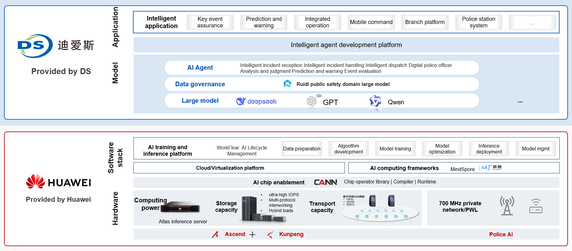 Relying on Huawei's strong computing power, storage capacity, delivery capacity, and communication support, the 4th-Generation AI Integrated Command Center integrates a variety of scenario-based AI agents independently developed by DS, including intelligent entities such as digital police officers, analysis and research, prediction and early warning, and incident assessment. It supports multiple policing command applications, such as major event security, prediction and early warning, and joint operations, and builds an end-to-end intelligent command system covering the entire process of "pre-incident prevention - in-incident handling - post-incident assessment".